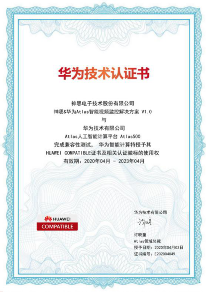 4月3日,神思電子智能視頻監(jiān)控方案順利完成華為技術(shù)有限公司Atlas人工智能計(jì)算平臺(tái)Atlas500兼容性測(cè)試,獲得了HUAWEI COMPATIBLE證書(shū)及相關(guān)認(rèn)證徽標(biāo)的使用權(quán),標(biāo)志著神思電子正式加入華為昇騰生態(tài),未來(lái)雙方將共同進(jìn)行智能視頻監(jiān)控解決方案的推廣,為行業(yè)客戶(hù)提供技術(shù)保證。