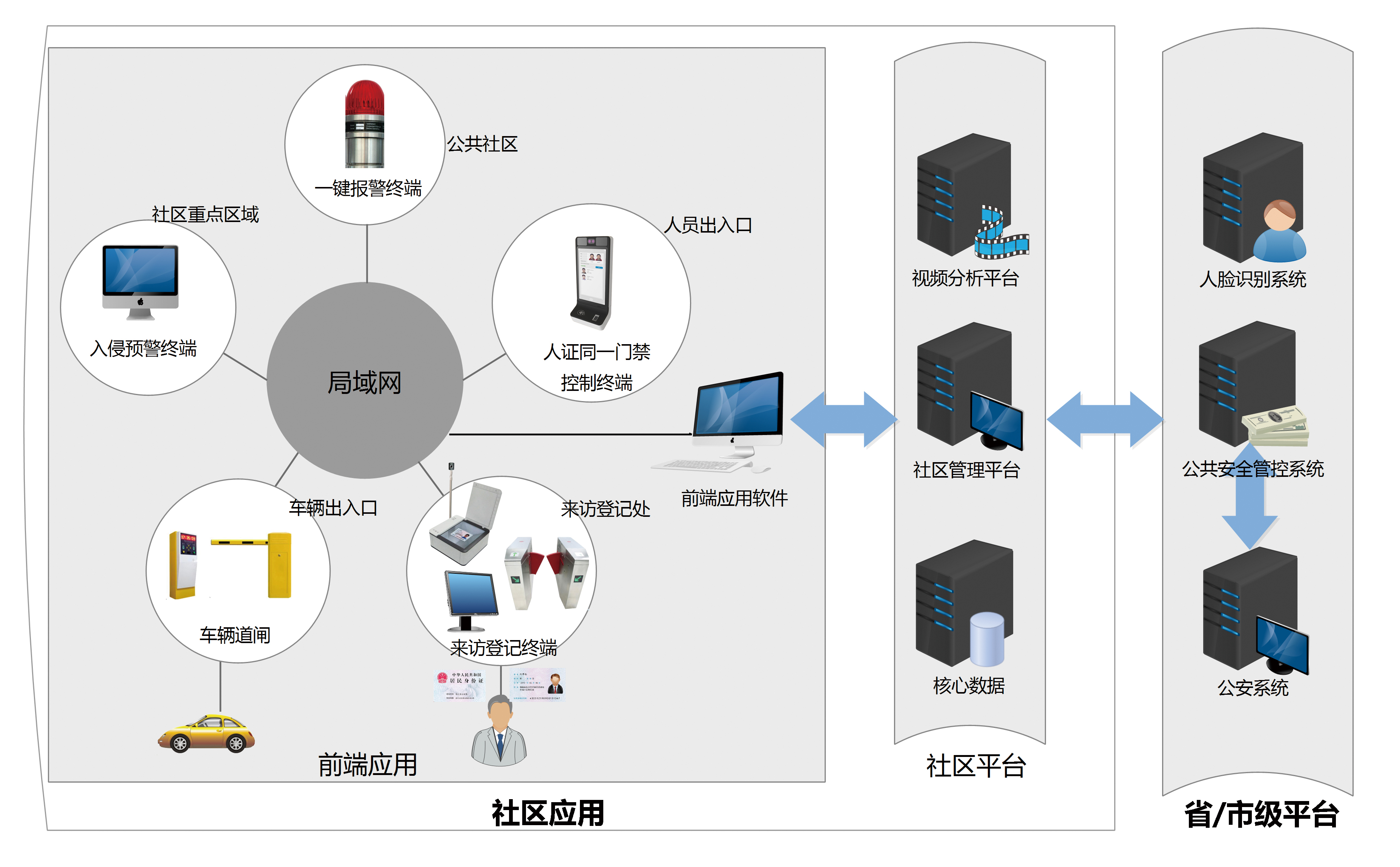 各類身份信息采集終端+園區(qū)管理平臺+省市級管理平臺。身份信息采集終端包括:證卡識讀終端(含人像、指紋采集)、車牌車型識別終端、訪客登記設(shè)備、門禁控制設(shè)備;管理平臺包含人員信息采集、人證同一認(rèn)證、聯(lián)網(wǎng)核查、車牌識別、自動通關(guān)、門禁控制、入侵預(yù)警、一鍵報警等管理子系統(tǒng)。